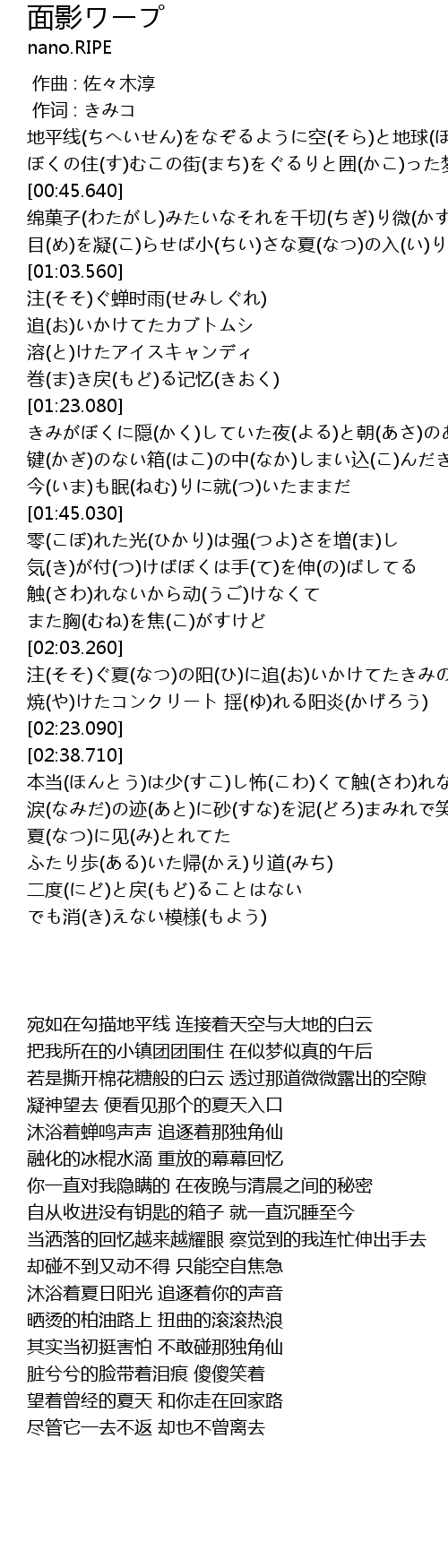 | [01:13.720] | 溶(と)けたアイスキャンディ 巻(ま)き戻(もど)る记忆(きおく) |