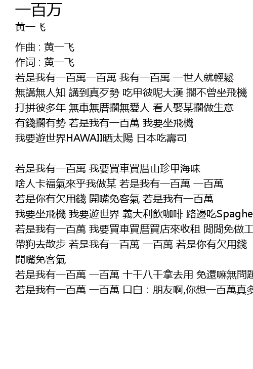 | 若是我有一百萬 一百萬 十千八千拿去用 免還嘛無問題 | |