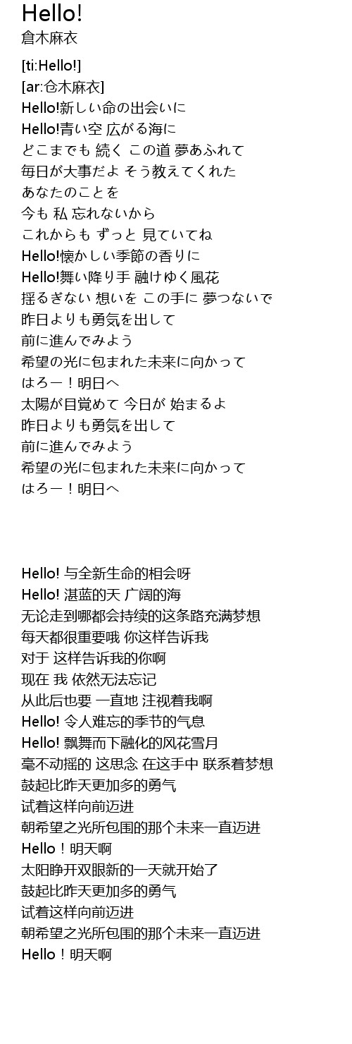| [01:54.866] | Hello!舞い降り手 融けゆく風花 |