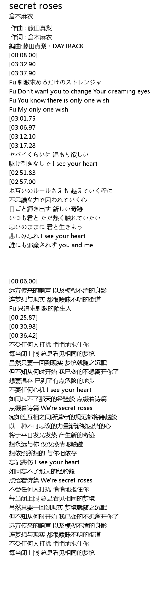 | [01:48.62][02:57.00] | zhuì We' re secret roses |
