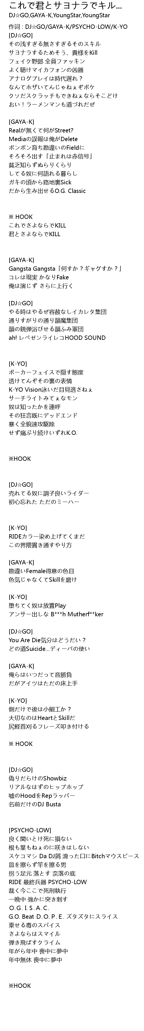 | 作词 : DJ☆GO/GAYA-K/PSYCHO-LOW/K-YO | |
