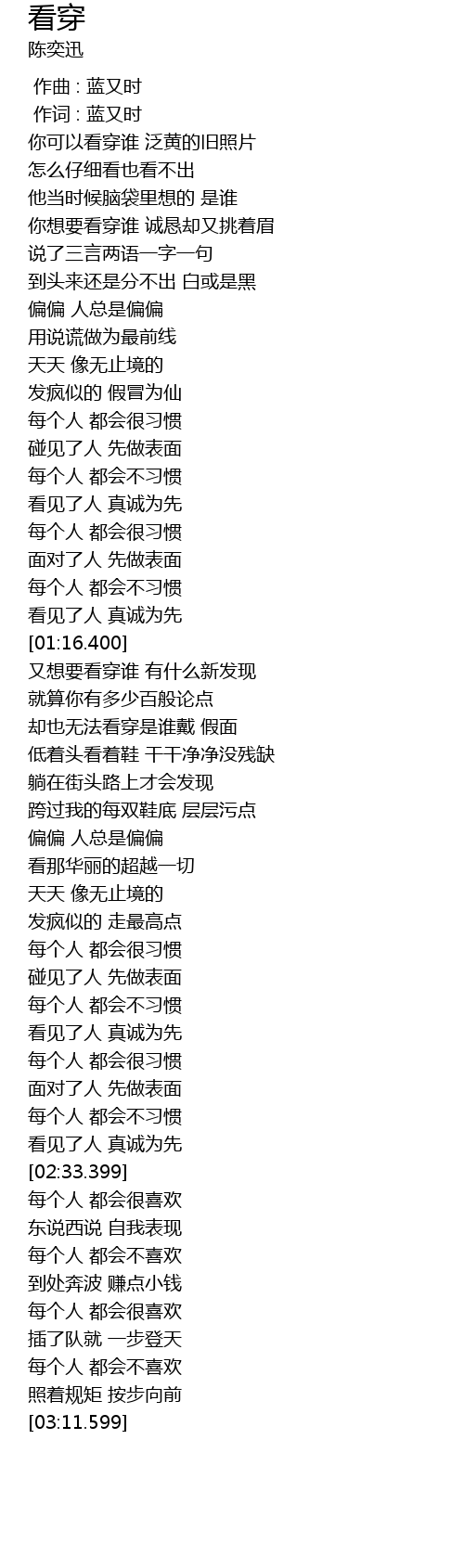 | [02:28.728] | kàn jiàn le rén zhēn chéng wèi xiān |