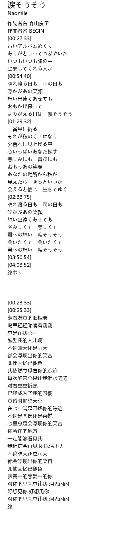 | [01:21.12] | よみがえる日は 涙そうそう |