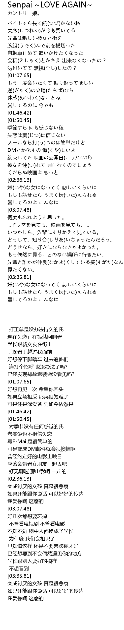 | [03:22.87] | どうせなら、好きにならなきゃよかった。 |