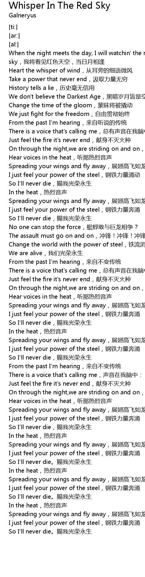 | [00:25.37] | When the night meets the day, I will watchin' the red sky, wǒ jiāng kàn jiàn hóng sè tiān kōng, dāng rì yuè xiàng féng |