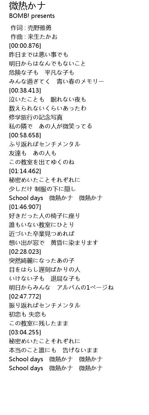 | [01:35.334] | School days 微熱かナ 微熱かナ |