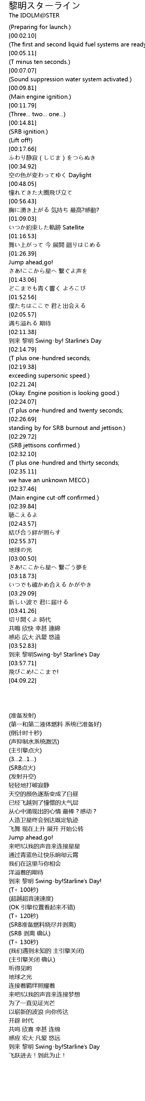 | [02:11.91] | 到来 黎明 Swing-by! Starline's Day |