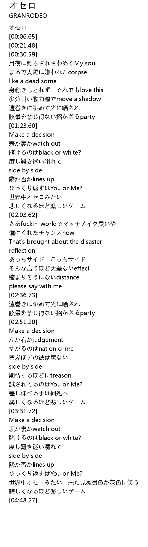 | [04:21.21] | 世界中オセロみたい 未だ見ぬ景色が灰色に笑う |