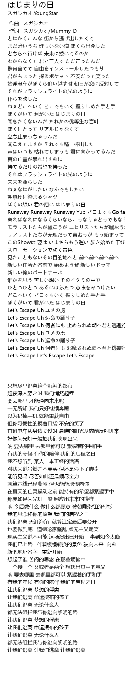 | [03:56.800] | Let's Escape Uh 何者にも 止められぬ朝へ君と逃避行 |