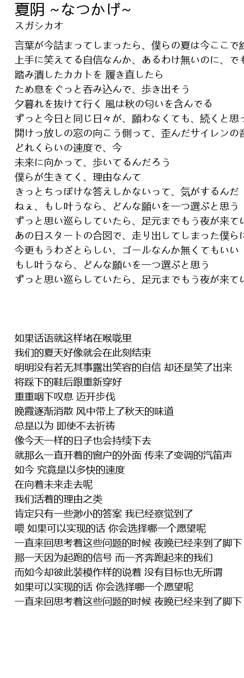 | [00:13.66] | 言葉が今詰まってしまったら、僕らの夏は今ここで終わってしまいそう |