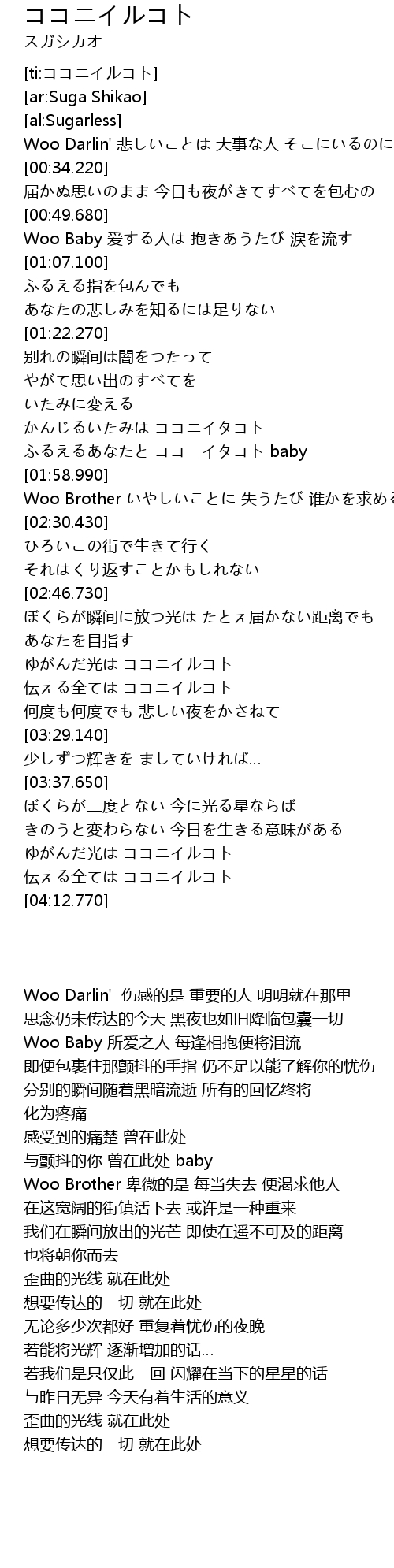 | [00:18.310] | Woo Darlin' 悲しいことは 大事な人 そこにいるのに |