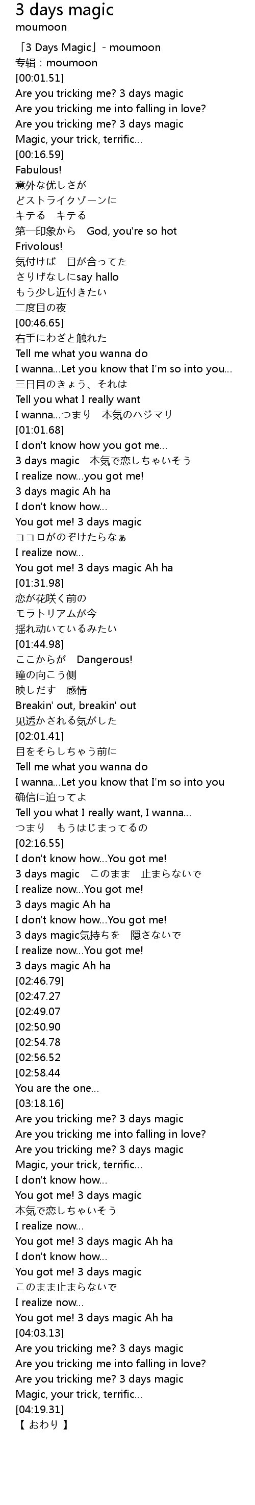 | [04:00.26] | You got me! 3 days magic Ah ha |
