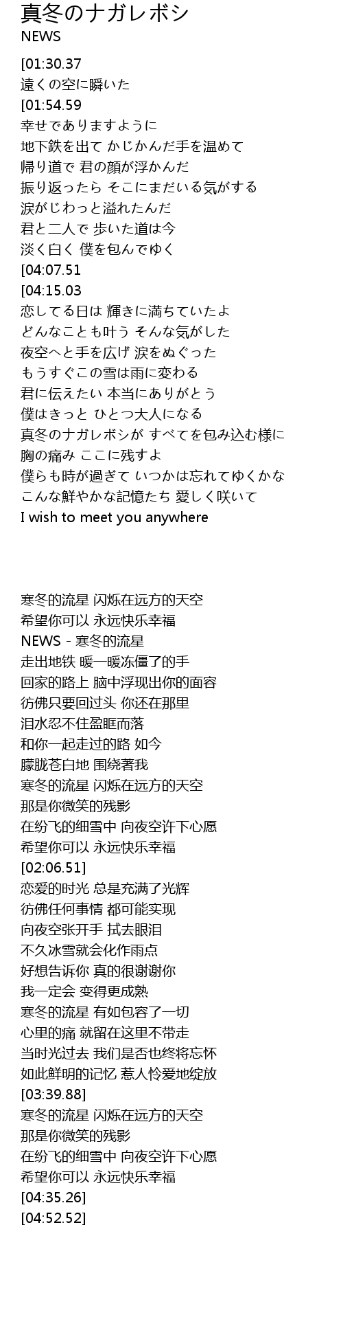 | [00:05.03][01:30.37][03:59.12] | 真冬のナガレボシが 遠くの空に瞬いた |