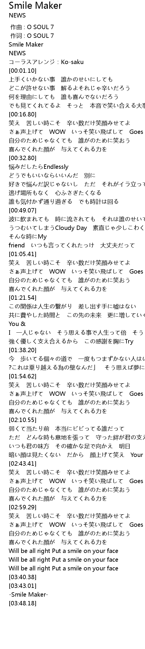 | [02:43.61] | 笑え 苦しい時こそ 辛い数だけ笑顔みせてよ |