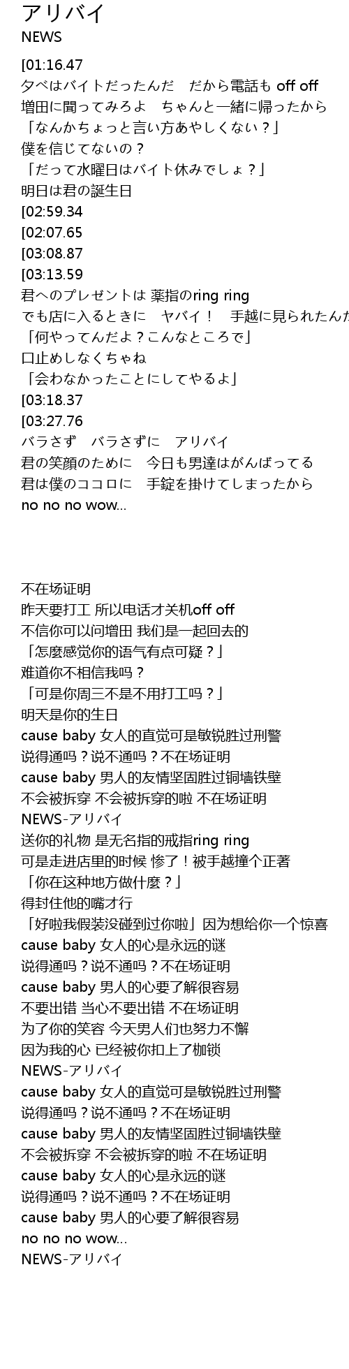 | [00:10.00][01:16.47][02:40.69][03:37.33] | NEWS-アリバイ |