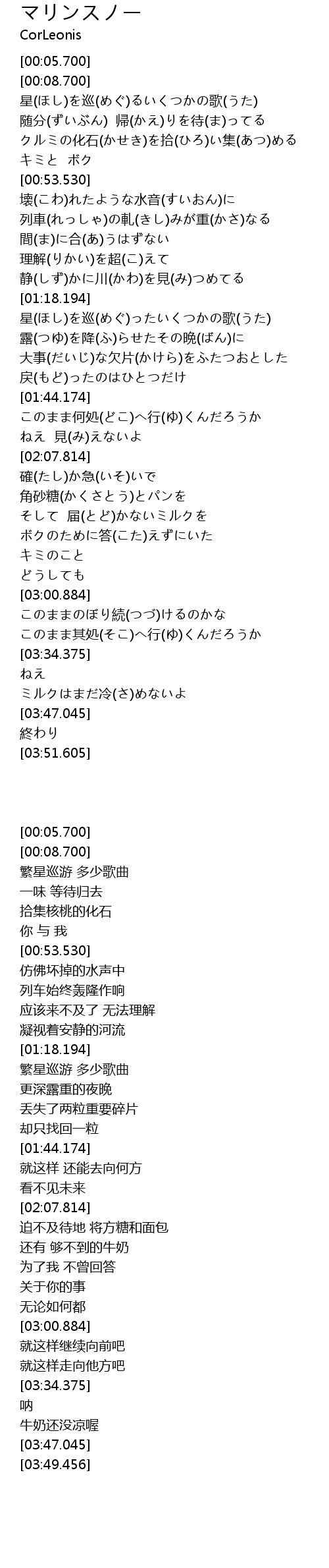 | [01:18.483] | 星(ほし)を巡(めぐ)ったいくつかの歌(うた) |