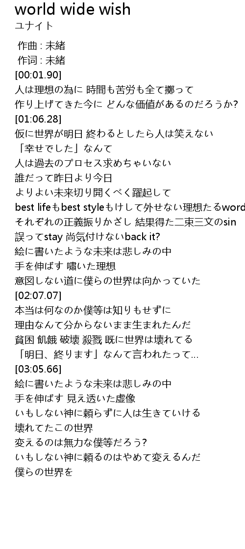 | [02:48.76] | 貧困 飢餓 破壊 殺戮 既に世界は壊れてる |