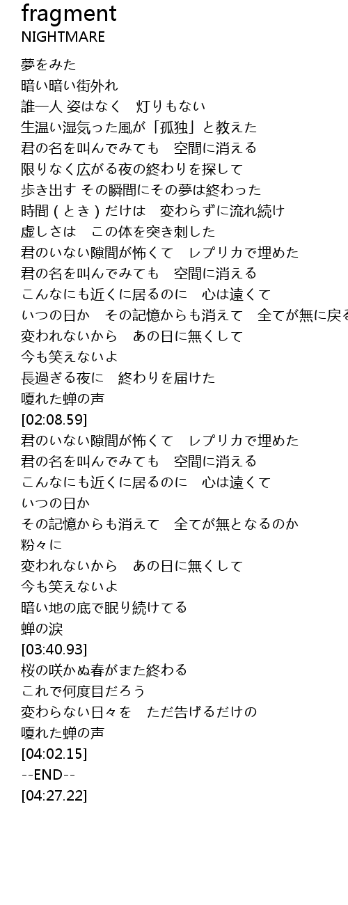 | [00:54.42] | 君の名を叫んでみても 空間に消える |