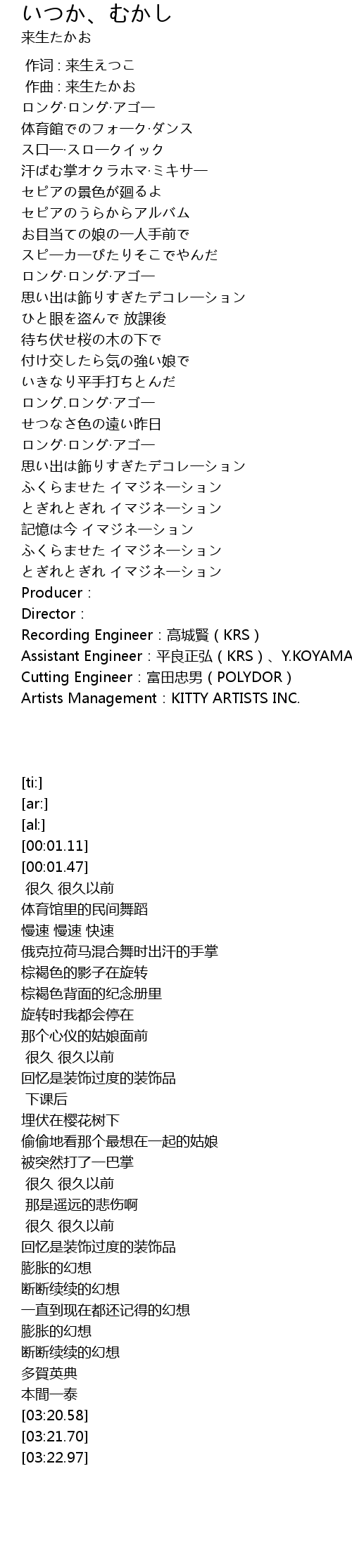 | [03:21.70] | Assistant Engineer: píng liáng zhèng hóng KRS Y. KOYAMA POLYDOR |