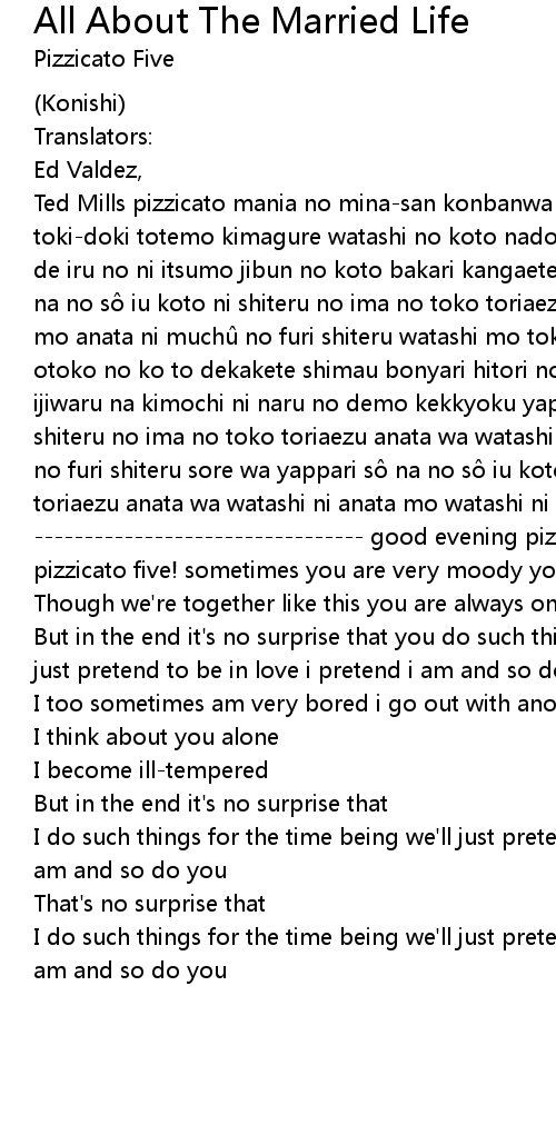 | Ted Mills pizzicato mania no minasan konbanwa pizzicato five desu anata wa tokidoki totemo kimagure watashi no koto nado wasureta mitai k shite futari de iru no ni itsumo jibun no koto bakari kangaeteru no demo kekkyoku yappari s na no s iu koto ni shiteru no ima no toko toriaezu anata wa watashi ni watashi mo anata ni much no furi shiteru watashi mo tokidoki totemo taikutsu hoka no otoko no ko to dekakete shimau bonyari hitori no anata no koto wo omou to ijiwaru na kimochi ni naru no demo kekkyoku yappari s na no s iu koto ni shiteru no ima no toko toriaezu anata wa watashi ni watashi mo anata ni much no furi shiteru sore wa yappari s na no s iu koto ni shiteru no ima no toko toriaezu anata wa watashi ni anata mo watashi ni much no furi shiteru good evening pizzicato maniacs! we are pizzicato five! sometimes you are very moody you seem to forget all about me | |