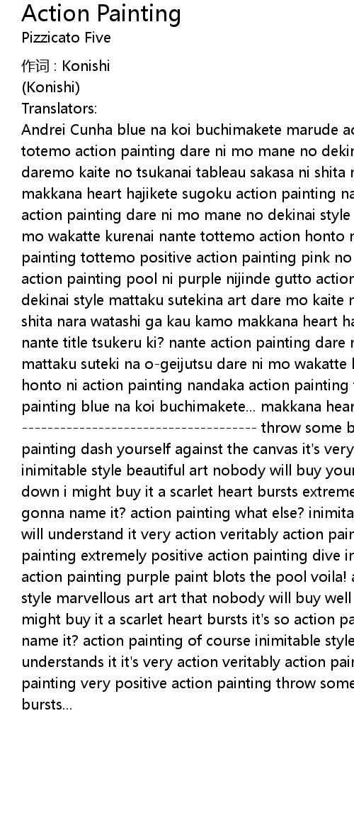 | Andrei Cunha blue na koi buchimakete marude action painting canvas ni taiatari totemo action painting dare ni mo mane no dekinai style mattaku sutekina art daremo kaite no tsukanai tableau sakasa ni shita nara watashi ga kau kamo makkana heart hajikete sugoku action painting nante title tsukeru ki? nante action painting dare ni mo mane no dekinai style mattaku suteki na art dare ni mo wakatte kurenai nante tottemo action honto ni action painting nandaka action painting tottemo positive action painting pink no pool ni tobikonde hidoku action painting pool ni purple nijinde gutto action painting dare ni mo mane no dekinai style mattaku sutekina art dare mo kaite no tsukanai tableau sakasa ni shita nara watashi ga kau kamo makkana heart hajikete sugoku action painting nante title tsukeru ki? nante action painting dare ni mo mane no dekinai style mattaku suteki na ogeijutsu dare ni mo wakatte kurenai nante tottemo action honto ni action painting nandaka action painting tottemo positive action painting blue na koi buchimakete... makkana heart hajikete... throw some blue love it' s like action painting dash yourself against the canvas it' s very action painting an inimitable style beautiful art nobody will buy your work well if it' s upside down i might buy it a scarlet heart bursts extremely action painting what you' re gonna name it? action painting what else? inimitable style wonderful art nobody will understand it very action veritably action painting somewhat action painting extremely positive action painting dive into a pink pool painfully action painting purple paint blots the pool voila! action painting inimitable style marvellous art art that nobody will buy well if you turn it upside down i might buy it a scarlet heart bursts it' s so action painting what are you gonna name it? action painting of course inimitable style wonderful art nobody understands it it' s very action veritably action painting somewhat action painting very positive action painting throw some blue love... a scarlet heart bursts... |