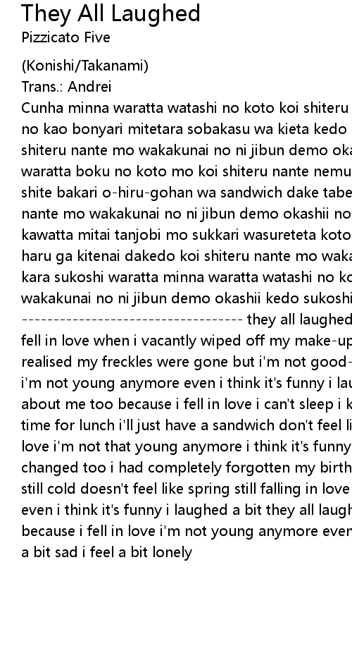 Cunha minna waratta watashi no koto koi shiteru nante o-kessho otoshita watashi no kao bonyari mitetara sobakasu wa kieta kedo demo bijin demo nai na no ni koi shiteru nante mo wakakunai no ni jibun demo okashii kara sukoshi waratta minna waratta boku no koto mo koi shiteru nante nemurenakute shigoto chu ni akubi shite bakari o-hiru-gohan wa sandwich dake tabetaku mo nai dakedo koi shiteru nante mo wakakunai no ni jibun demo okashii no sa sukoshi kanashii kedo boku mo kawatta mitai tanjobi mo sukkari wasureteta kotoshi no shigatsu wa mada samukute haru ga kitenai dakedo koi shiteru nante mo wakakunai no ni jibun demo okashii kara sukoshi waratta minna waratta watashi no koto koi shiteru nante mo wakakunai no ni jibun demo okashii kedo sukoshi kanashii sukoshii samishii ----------------------------------- they all laughed laughed about me because i fell in love when i vacantly wiped off my make-up staring at the looking-glass i realised my freckles were gone but i'm not good-looking and still i fell in love i'm not young anymore even i think it's funny i laughed a bit they all laughed about me too because i fell in love i can't sleep i keep yawning at work all the time for lunch i'll just have a sandwich don't feel like eating still falling in love i'm not that young anymore i think it's funny a bit funny it's sad but i changed too i had completely forgotten my birthday although it's april it's still cold doesn't feel like spring still falling in love i'm not that young even i think it's funny i laughed a bit they all laughed they laughed at me because i fell in love i'm not young anymore even i think it's funny but i feel a bit sad i feel a bit lonely |