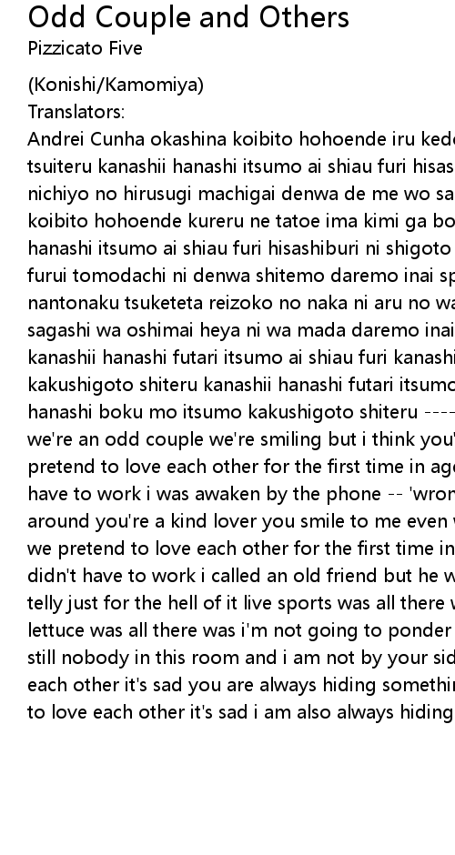 Andrei Cunha okashina koibito hohoende iru kedo tabun ima kimi wa boku ni uso tsuiteru kanashii hanashi itsumo ai shiau furi hisashiburi ni shigoto no nai nichiyo no hirusugi machigai denwa de me wo samaseba daremo inai yasashii koibito hohoende kureru ne tatoe ima kimi ga boku ni uso tsuitemo kanashii hanashi itsumo ai shiau furi hisashiburi ni shigoto no nai nichiyo no hirusugi furui tomodachi ni denwa shitemo daremo inai sports chukei bakari no terebi wo nantonaku tsuketeta reizoko no naka ni aru no wa shioreta lettuce dake machigai sagashi wa oshimai heya ni wa mada daremo inai kimi no soba ni boku wa inai kanashii hanashi futari itsumo ai shiau furi kanashii hanashi kimi wa istumo kakushigoto shiteru kanashii hanashi futari itsumo ai shiau furi kanashii hanashi boku mo itsumo kakushigoto shiteru ------------------------------------ we're an odd couple we're smiling but i think you're lying to me it's sad we pretend to love each other for the first time in ages on a sunday when i didn't have to work i was awaken by the phone -- 'wrong number' and there was nobody around you're a kind lover you smile to me even when you're lying to me it's sad we pretend to love each other for the first time in ages on a sunday when i didn't have to work i called an old friend but he wasn't home i turned on the telly just for the hell of it live sports was all there was in the fridge old lettuce was all there was i'm not going to ponder over mistakes anymore there is still nobody in this room and i am not by your side it's sad we pretend to love each other it's sad you are always hiding something from me it's sad we pretend to love each other it's sad i am also always hiding something from you |