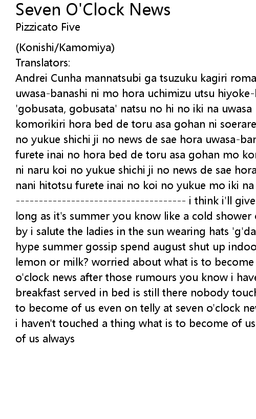 Andrei Cunha mannatsubi ga tsuzuku kagiri romance mo shibaraku toriyame hora uwasa-banashi ni mo hora uchimizu utsu hiyoke-boshi no musume-tachi ni aisatsu 'gobusata, gobusata' natsu no hi no iki na uwasa hachigatsu wa heya ni komorikiri hora bed de toru asa gohan ni soerareta milk to lemon ki ni naru koi no yukue shichi ji no news de sae hora uwasa-banashi no sono ato wa nani hitotsu furete inai no hora bed de toru asa gohan mo kono goro wa te tsukazu no mama ki ni naru koi no yukue shichi ji no news de sae hora uwasa-banashi no sono ato wa nani hitotsu furete inai no koi no yukue mo iki na uwasa mo itsumo futari wa ------------------------------------- i think i'll give a break to love for as long as it's summer you know like a cold shower on all these rumours as i pass by i salute the ladies in the sun wearing hats 'g'day, ma'am, how d'you do' some hype summer gossip spend august shut up indoors you know have breakfast in bed lemon or milk? worried about what is to become of us even on telly at seven o'clock news after those rumours you know i haven't touched a thing you know the breakfast served in bed is still there nobody touched it worried about what is to become of us even on telly at seven o'clock news after those rumours you know i haven't touched a thing what is to become of us some hype gossip and the two of us always |
