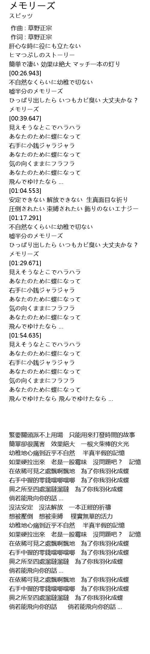 | [02:13.737] | 右手に小銭ジャラジャラ あなたのために蝶になって |