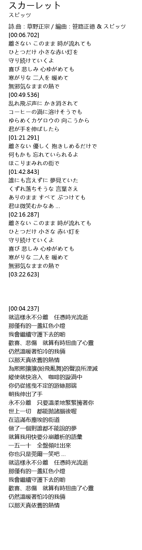 | [00:04.237] | 詩.曲:草野正宗/編曲:笹路正徳 & スピッツ |