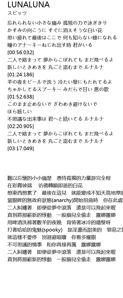 | [02:09.750] | 不思議な出来事は 君へと続いてる ルナルナ |