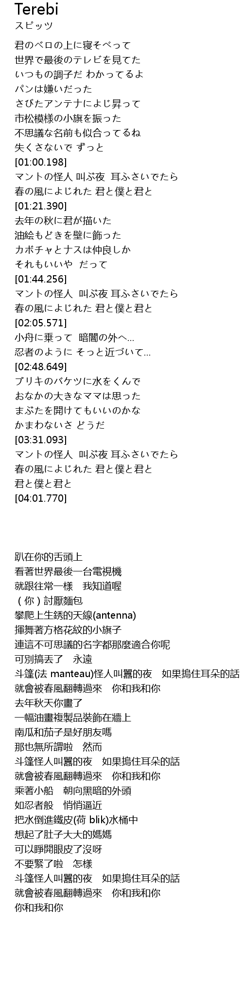 | [01:44.410] | マントの怪人 叫ぶ夜 耳ふさいでたら |