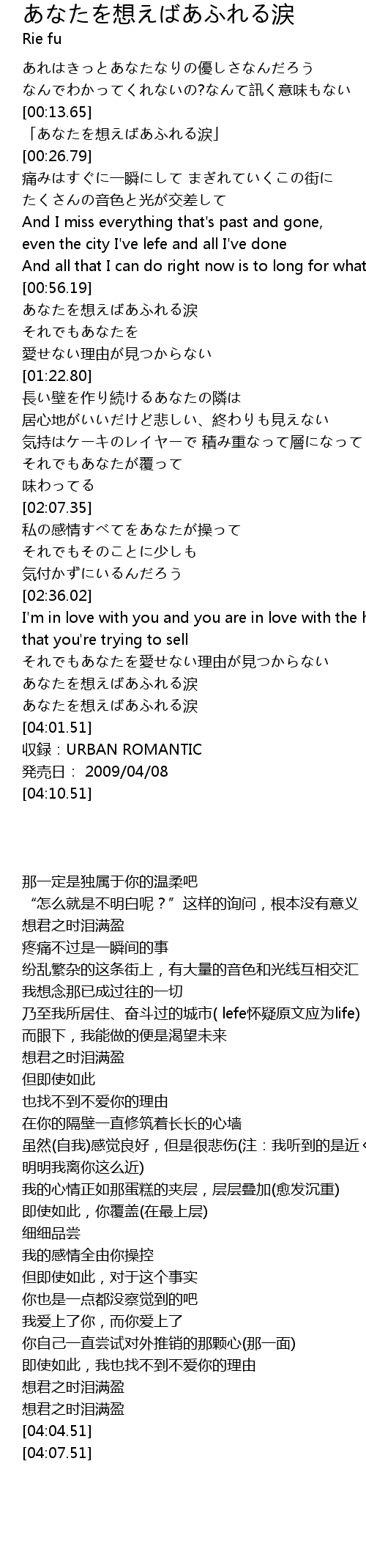 | [00:57.58] | あなたを想えばあふれる涙 |