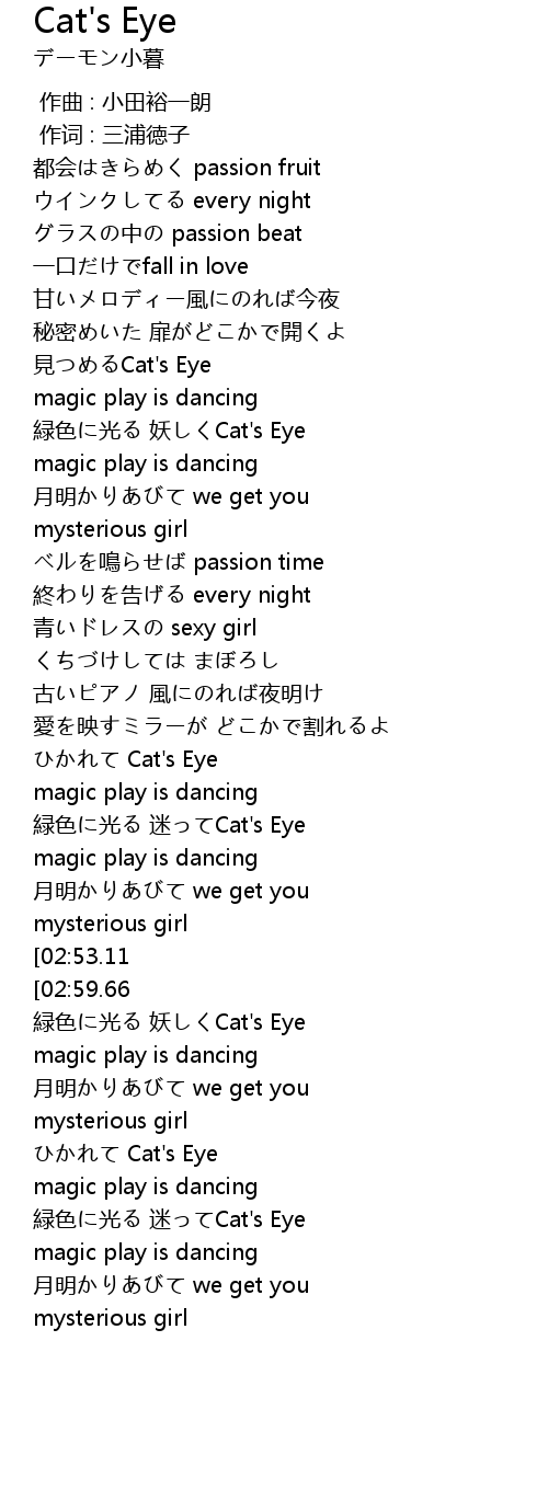 | [03:06.30][02:53.11] | jiàn Cat' s Eye |