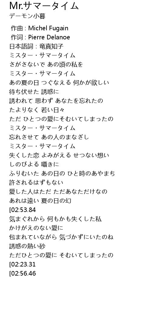 | [03:08.74][02:53.84] | ミスター・サマータイム |