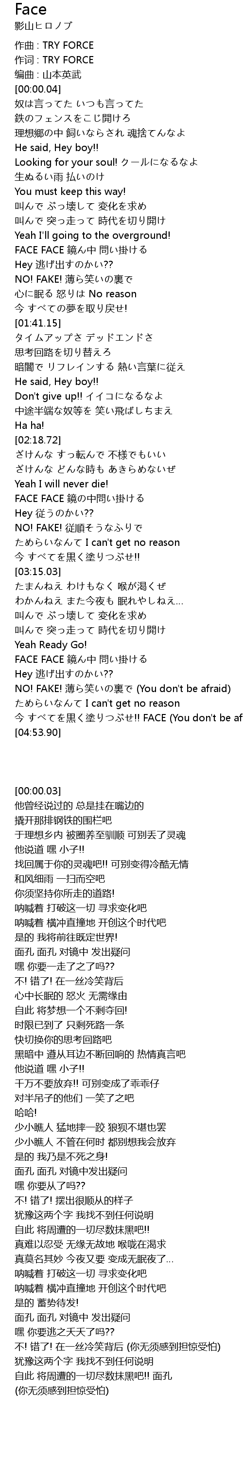 | [04:41.11] | 今 すべてを黒く塗りつぶせ!! FACE (You don't be afraid) |