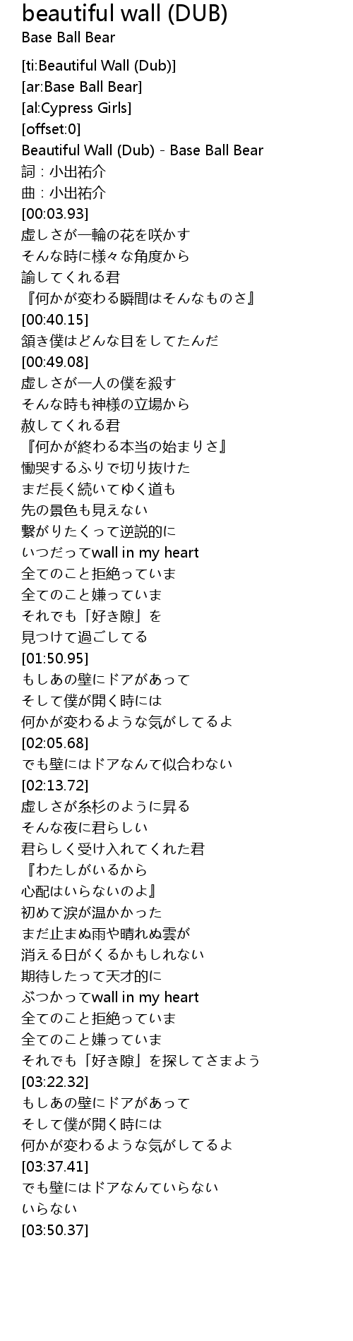 | [00:00.95] | Beautiful Wall (Dub) - Base Ball Bear |