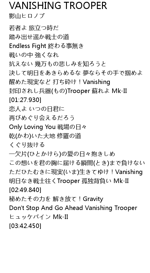 | [03:30.070] | Don't Stop And Go Ahead Vanishing Trooper |