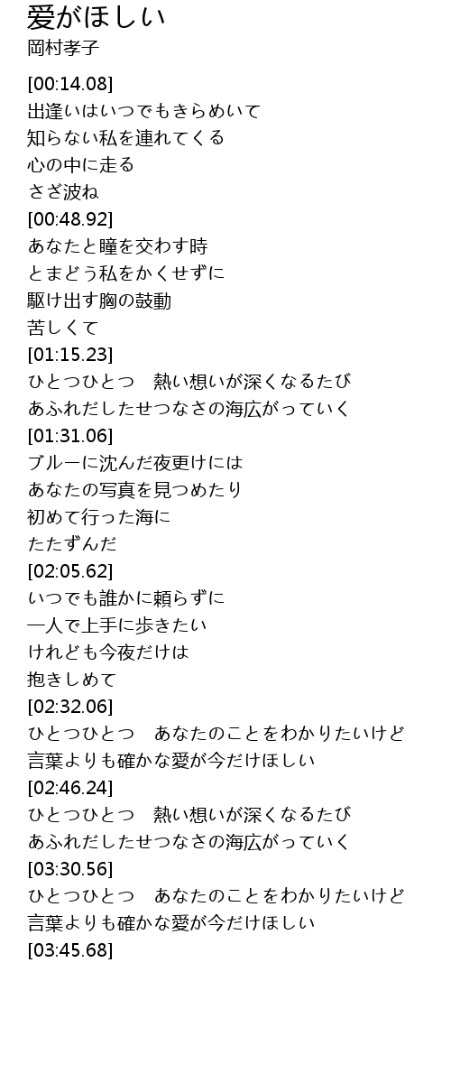 | [03:37.68] | 言葉よりも確かな愛が今だけほしい |