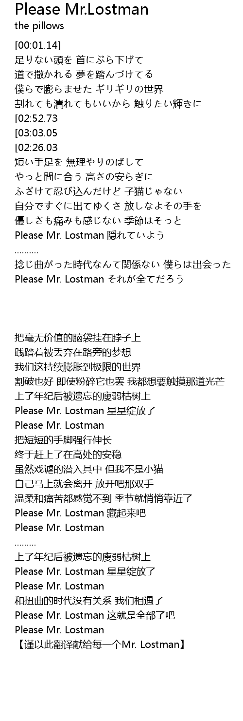 | [01:19.31][02:26.03][03:09.21][03:30.45] | Please Mr. Lostman |