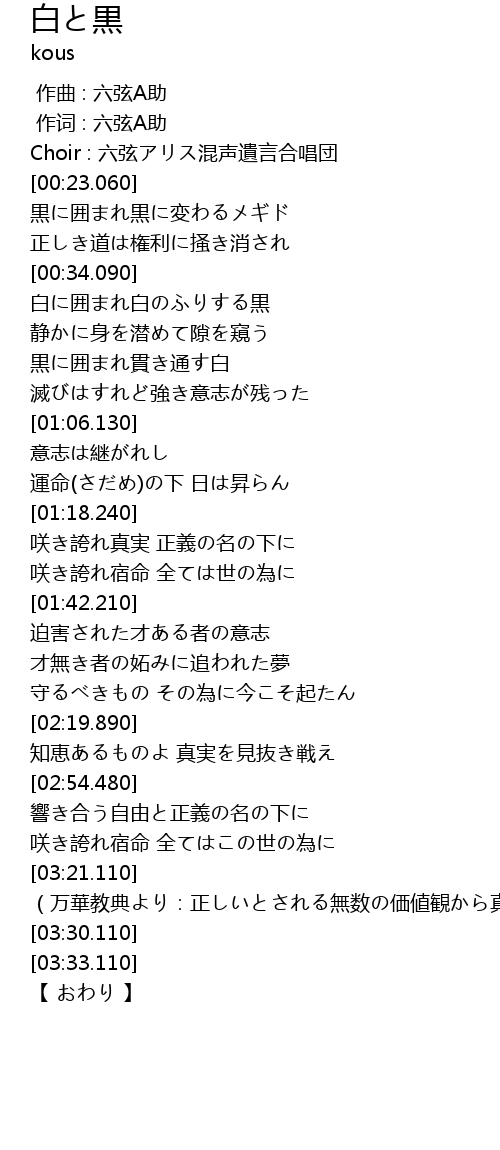 | [00:46.510] | 白に囲まれ白のふりする黒 |