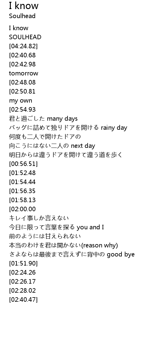 | [03:03.98][02:48.08][02:16.29][01:20.79][00:25.23] | I know you care for me |