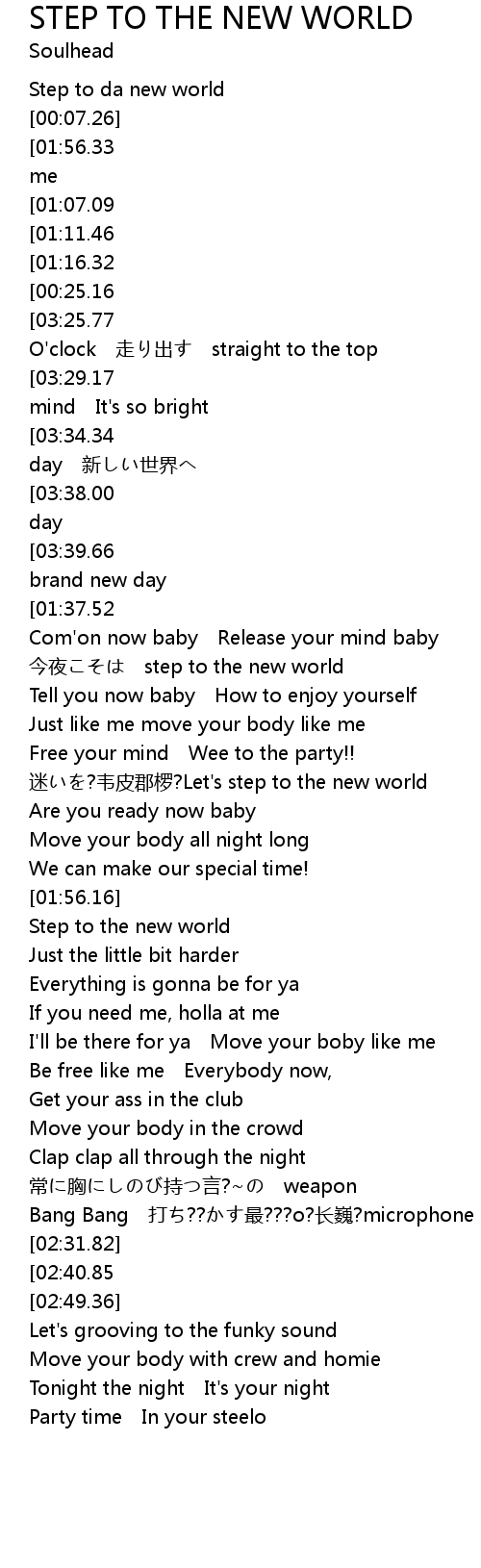 | [03:52.31][03:34.34][03:16.42][01:29.40][00:35.69] | Brand new day 新しい世界へ |