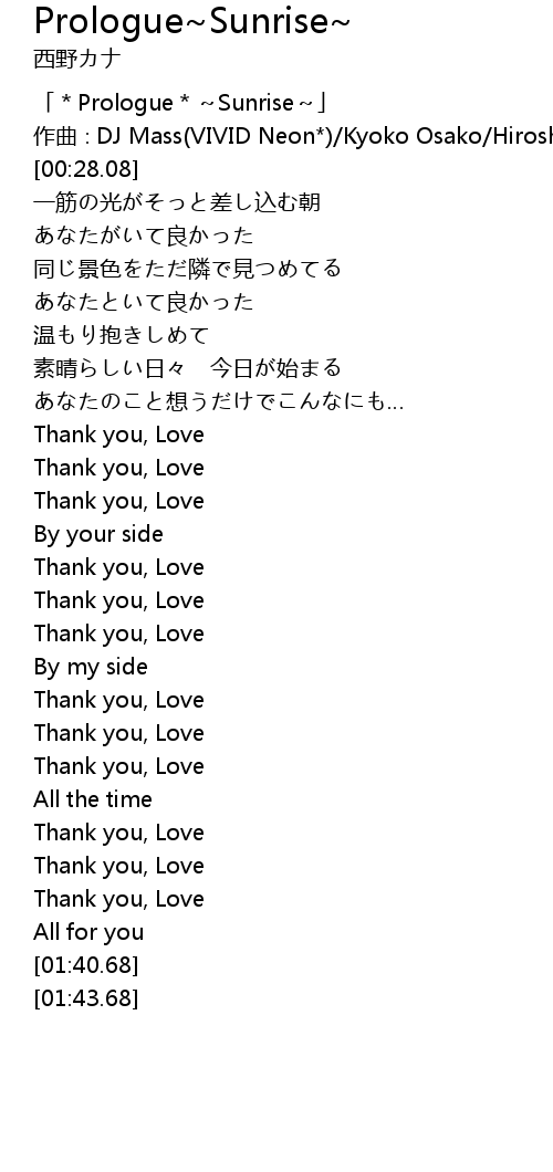 | [00:01.08] | 「*Prologue*~Sunrise~」 |