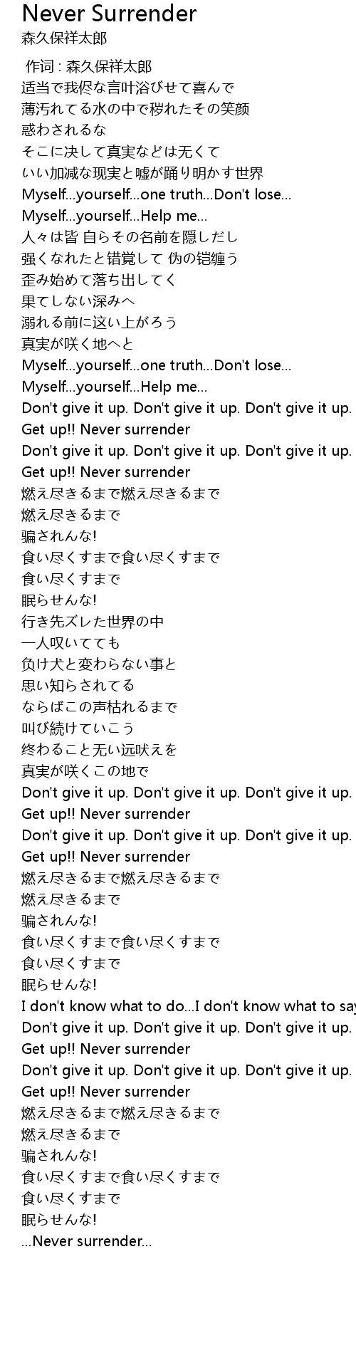 | [04:00.22] | Get up!! Never surrender |