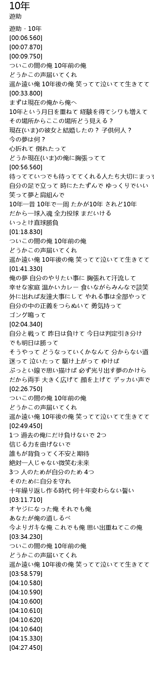 | [00:11.120] | ついこの間の俺 10年前の俺 どうかこの声届いてくれ |