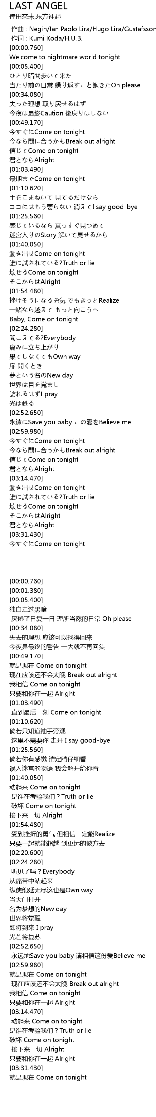| [01:14.990] | ココにはもう要らない 消えてI say good-bye |