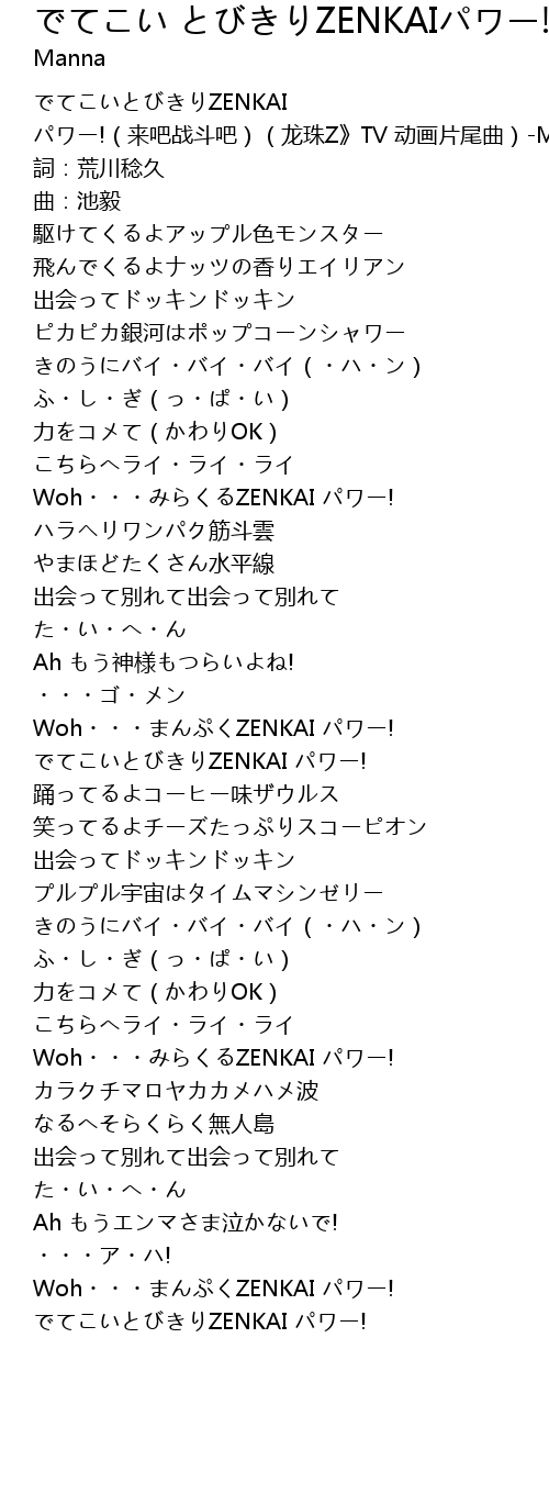 | [00:00.00] | でてこいとびきりZENKAI パワー!(来吧战斗吧)(龙珠Z》TV 动画片尾曲)-MANNA |