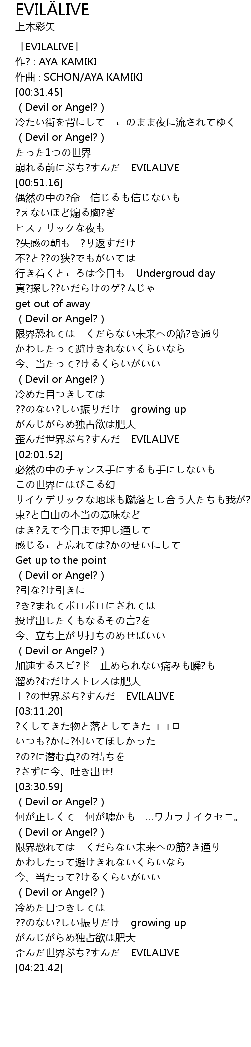 | [03:03.61] | 上?の世界ぶち?すんだ EVILALIVE |