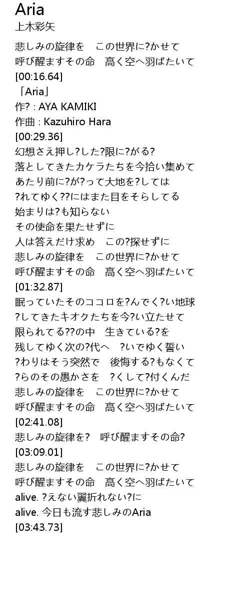 | [03:35.10] | alive. 今日も流す悲しみのAria |